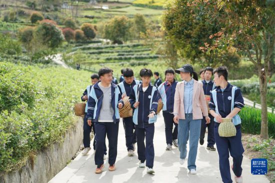 3月29日,在紫阳县洄水镇茶稻村,紫阳县职业教育中心茶叶专业的师生完成采茶后下山。