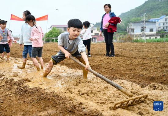 4月1日,在柳江区进德镇龙新村龙朝屯,小朋友在家长陪同下体验平整土地。