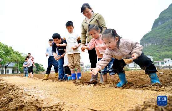 4月1日,在柳江区进德镇龙新村龙朝屯,小朋友在家长陪同下学习播撒稻种。