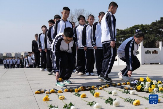 4月3日,沈阳市一四三中学学生在沈阳市抗美援朝烈士陵园向纪念碑献花。