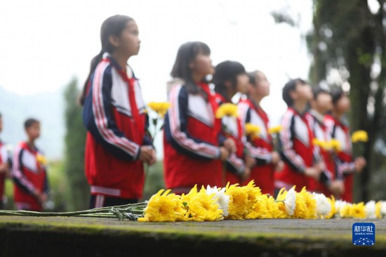 4月3日,江西省宜春市上高县田心中心小学的孩子们来到当地马鞍山革命烈士陵园开展清明祭扫活动。