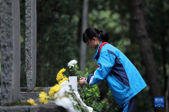4月3日,在贵州省黔东南苗族侗族自治州锦屏县龙大道烈士陵园,一名少先队员向红军烈士墓敬献鲜花。