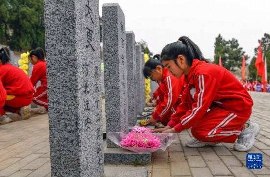 4月3日,学生在河北省遵化市铁厂镇甲山烈士陵园献花。