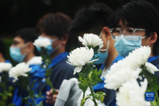 4月3日,杭州英才高中的学生在杭州革命烈士陵园向烈士献花。