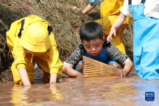 4月10日,四川省广安市武胜县东方红幼儿园的小朋友在龙女镇的稻田里抓鱼。