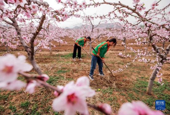 4月10日,河北省遵化市东旧寨镇梁屯中心小学的学生在桃树果园体验锄草劳动。
