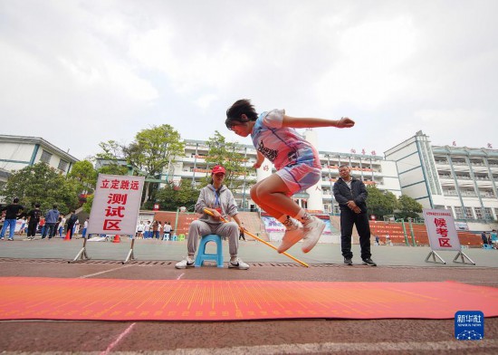 4月13日,在贵州省丹寨县第三中学,考生参加立定跳远项目测试。