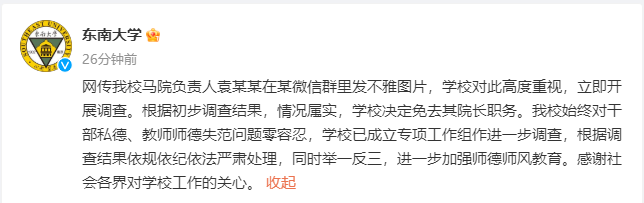 东南大学通报“院长发不雅照”:情况属实,已免职