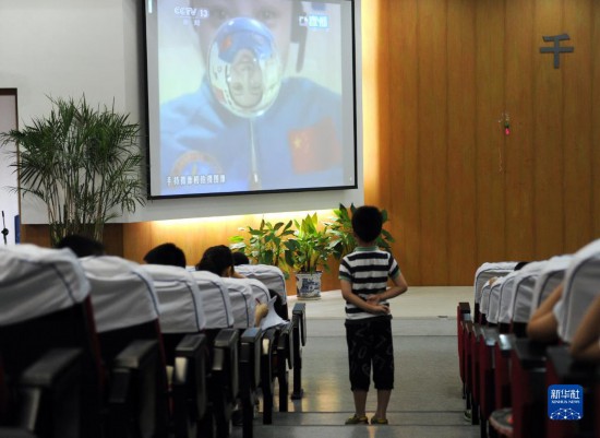 在杭州保俶塔实验学校,小学生吴潼站在走道上观看太空授课(资料图片,2013年6月20日摄)。当日,航天员王亚平在聂海胜、张晓光协助下进行首次太空授课,全国6000余万名中小学生观看授课直播。