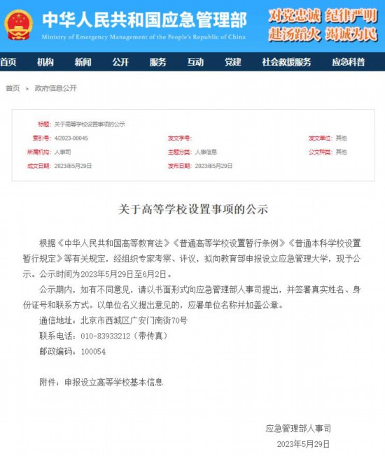 据应急管理部网站消息,29日,应急管理部人事司发布关于高等学校设置事项的公示。公示提出,根据《中华人民共和国高等教育法》《普通高等学校设置暂行条例》《普通本科学校设置暂行规定》等有关规定,经组织专家考察、评议,拟向教育部申报设立应急管理大学,现予公示。公示时间为2023年5月29日至6月2日。