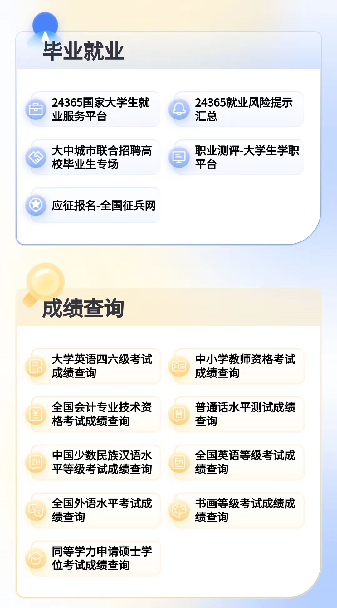 细分到大学生群体,“伟德国际1946bv官网+”客户端便民服务汇总小程序提供在校期间多种国家考试成绩的查询服务,并为大学生群体提供毕业就业资讯及服务,实现从入学到就业“服务闭环”: