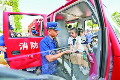 最近,各地学校陆续开启新学期。图为8月31日,在四川省眉山市彭山区学院路幼儿园,眉山市彭山区消防救援大队的消防员为小朋友们介绍消防车上的装备。新华社记者 王曦摄