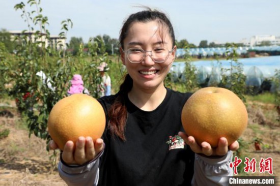 9月2日,潘雅洁展示刚采摘的梨子。 陈家乐 摄