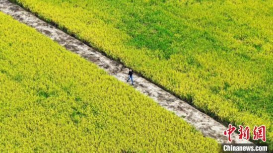 9月2日,潘雅洁在水稻种植基地查看水稻长势。 (无人机照片) 陈家乐 摄