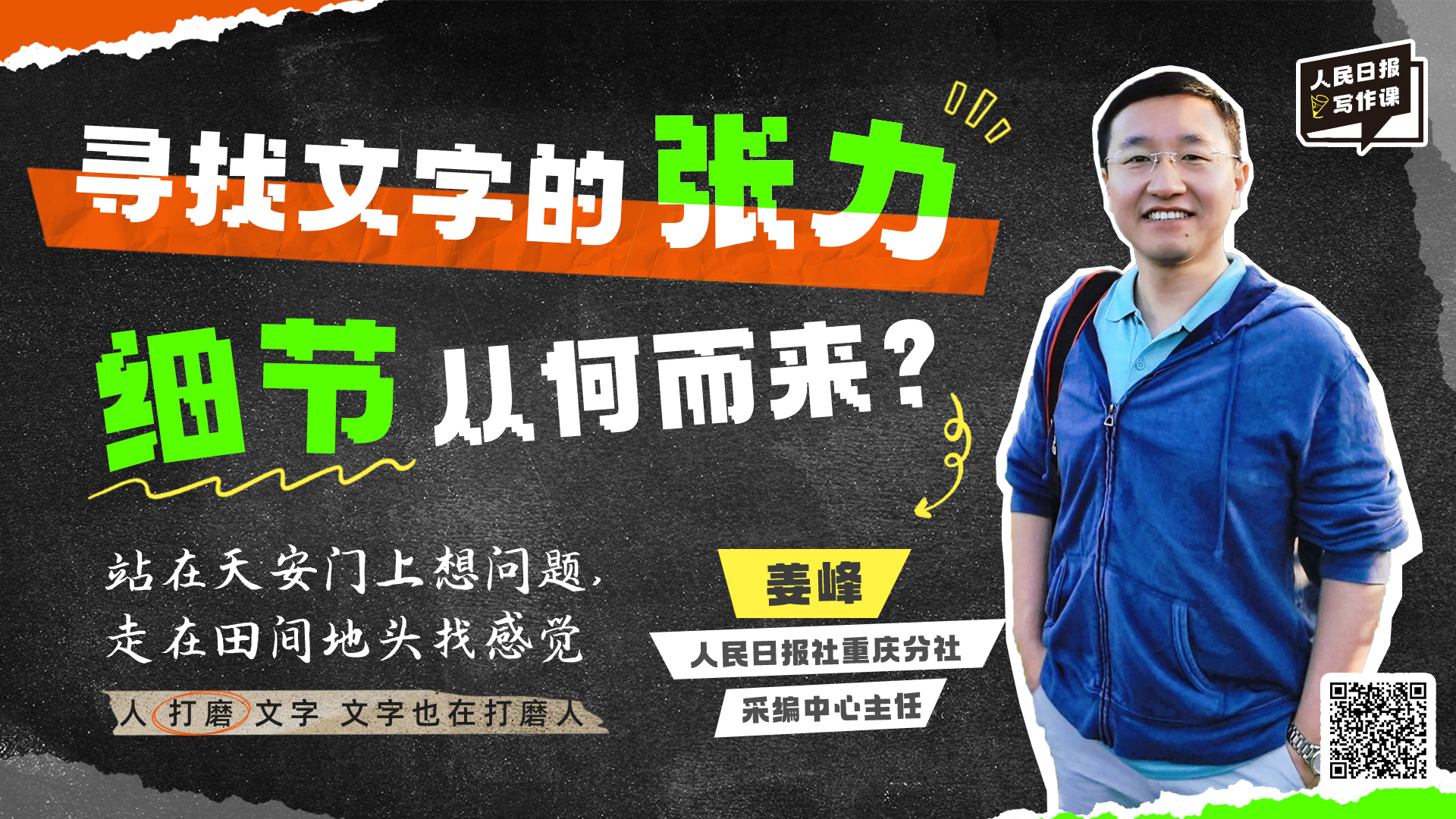 “人民日报写作课微课堂”首期邀请到人民日报社重庆分社采编中心主任姜峰。在每条短短几分钟的系列视频中,姜峰将带领读者一起寻找文字的张力,并结合采写经历和报道实例,剖析解答文章的细节从何而来、如何在采访中“刨根问底”、如何身临其境地“感受”现场等问题,干货满满。
