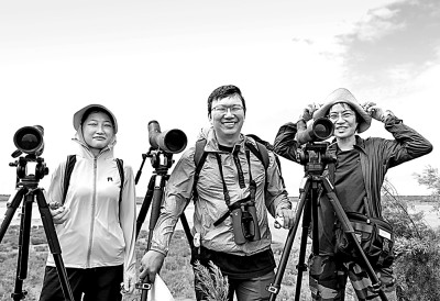 来自北京林业大学生态与自然保护学院东亚-澳大利西亚候鸟迁徙研究中心的贾亦飞(中)和他的团队成员在盐城黄海湿地工作。新华社发