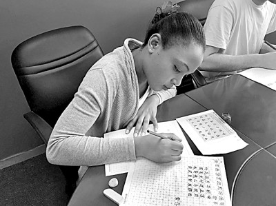 在南非德班理工大学孔子学院组织的汉字书写大赛中,学员李莎正在书写中国古典诗词。孔子学院供图