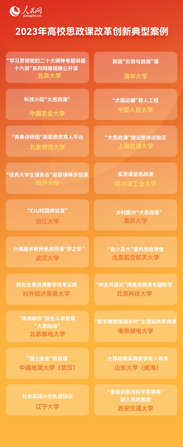 报告根据各高校思政课程的社会反响、信息传播量、主流媒体关注度、舆论反馈情况等维度,在全国征集推介“北京大学‘学习贯彻党的二十大精神专题讲座十六讲’系列网络视频公开课”“清华大学新版‘形势与政策’课”“中国农业大学科技小院‘大思政课’”“中国人民大学‘大国边疆’育人工程”“哈尔滨工业大学实景课堂思政课”等20个优秀思政课程案例,以期为各高校思政课改革创新提供借鉴启示。