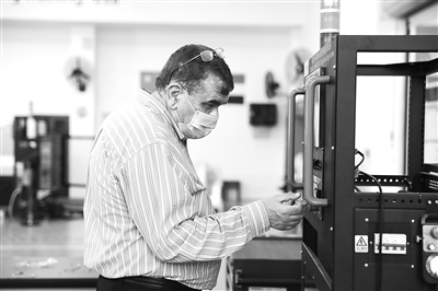 在位于埃及首都开罗的艾因夏姆斯大学鲁班工坊,工作人员查看设备工作情况。新华社记者 隋先凯摄