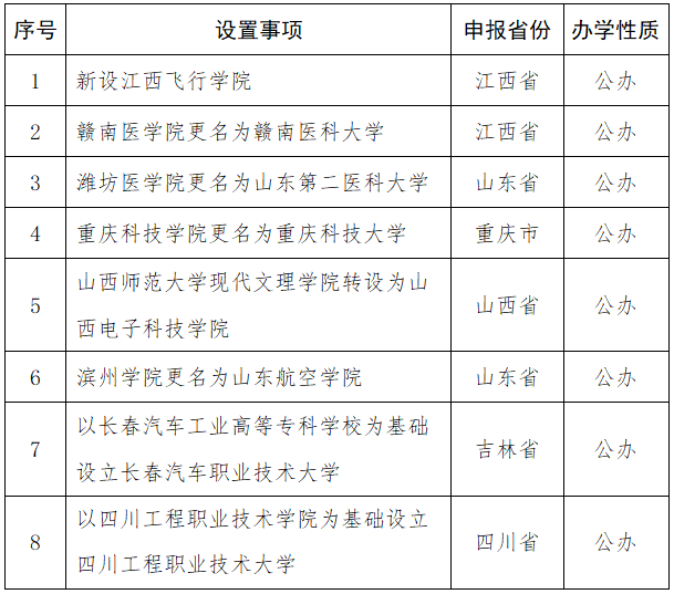 公示指出,根据《中华人民共和国高等教育法》《普通高等学校设置暂行条例》《普通本科学校设置暂行规定》《本科层次职业学校设置标准(试行)》有关规定以及第八届全国高等学校设置评议委员会考察评议结果,经教育部党组会议审议,拟同意设置江西飞行学院等8所学校,现予公示。公示时间为2023年11月6日至11月10日。