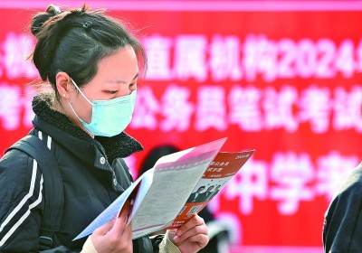 11月26日,中央机关及其直属机构2024年度考试录用公务员公共科目笔试在全国各考区统一举行。图为江苏省无锡市清名桥中学考点,一名考生在等候进场时复习。新华社发