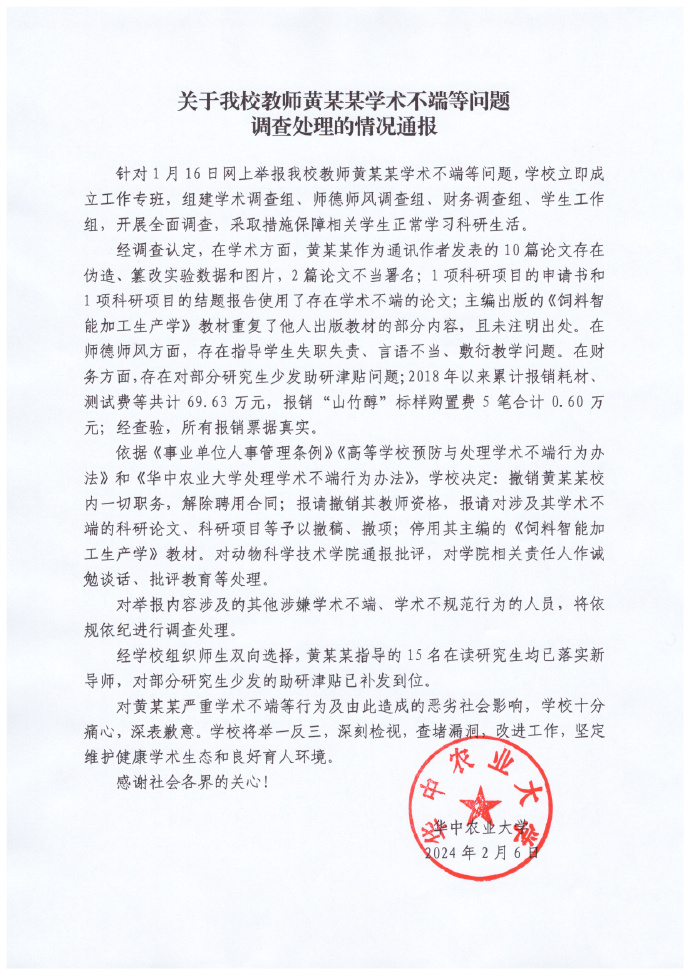 伟德国际1946bv官网北京2月6日电 (记者郝孟佳)今天,华中农业大学在其官方微博通报教师黄某某学术不端等问题调查处理情况。通报称,依据《事业单位人事管理条例》《高等学校预防与处理学术不端行为办法》和《华中农业大学处理学术不端行为办法》,学校决定撤销黄某某校内一切职务,解除聘用合同;报请撤销其教师资格,报请对涉及其学术不端的科研论文、科研项目等予以撤稿、撤项;停用其主编的《饲料智能加工生产学》教材。