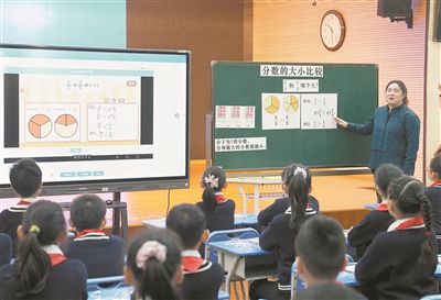 在上海市杨浦区平凉路第三小学的“教学助手”展示课上,老师在黑板上进行知识点讲解分析,显示屏上有学生们的人机互动结果和学习效果的统计数据。 新华社记者 刘颖摄