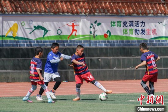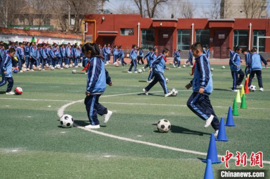 图为在西宁市大堡子小学,学生进行足球特色大课间展示。马铭言 摄