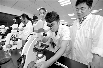 杭州职业技术学院生物制药专业客座教授、杭州市首席技师章飞龙(右一)正在指导学生实训。