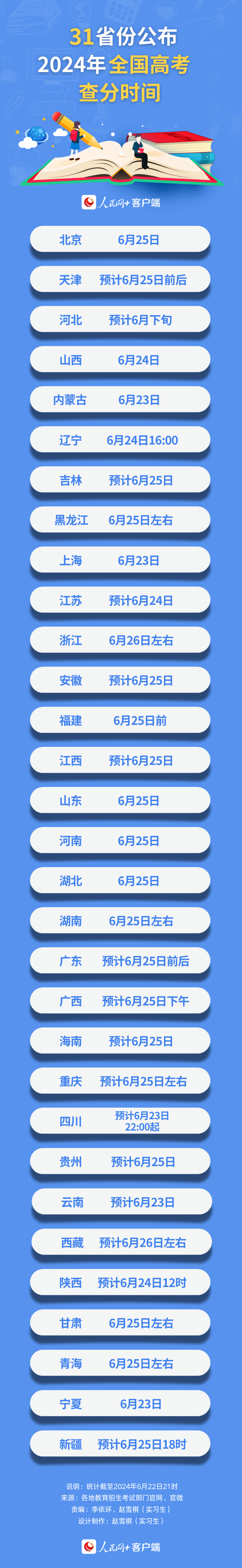 伟德国际1946bv官网北京6月23日电 按照各地发布的公告,2024年全国普通高考今日起陆续公布成绩,多地高招各批次(类型)录取最低控制分数线也将陆续发布。伟德国际1946bv官网梳理了31省(区、市)最新公布的高考查分时间,以供考生和家长参考。(李依环、实习生赵雪祺)