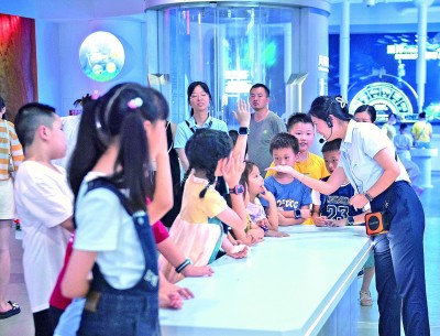 暑期,安徽省科技馆在常设展览之外开展研学营、科学课程、科学实验等科普活动,让孩子们在丰富多彩的活动中感受科技魅力。图为7月10日,工作人员与参加研学营的小朋友互动。(新华社记者 傅天摄)