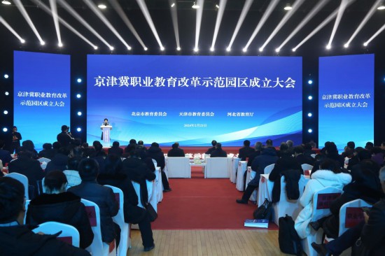 2024年2月21日,京津冀职业教育改革示范园区在北京经济管理职业学院固安校区正式成立。园区由北京市教育委员会、天津市教育委员会、河北省教育厅共同成立。三地教育行政部门按照“改革先行、聚合创新、协同发展”的理念,合作构建央地互动、区域联动协同平台,聚合三地优质产教资源要素,打造京津冀产教融合共同体,推进教育、科技、人才“三位一体”融合发展,以教育协同创新推动京津冀协同发展战略迈向更高水平,培养更多高素质技术技能人才、能工巧匠、大国工匠。