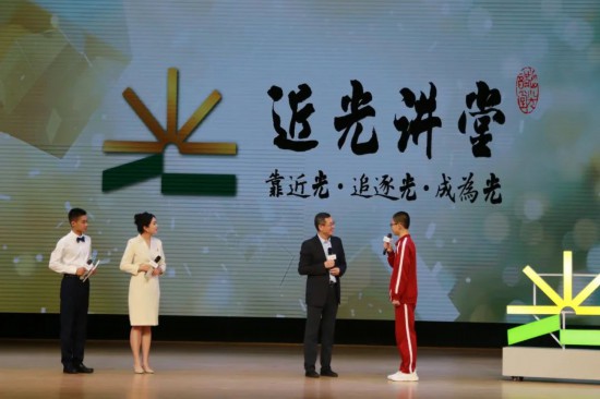 平谷中学学生郑时宇在“见字如面:大咖有约”环节与袁亚湘交流互动,就古人和现代机器求解圆周率的方法有何改进的问题进行请教。
