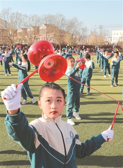 图为东营市东营区弘文小学的学生在练习抖空竹。