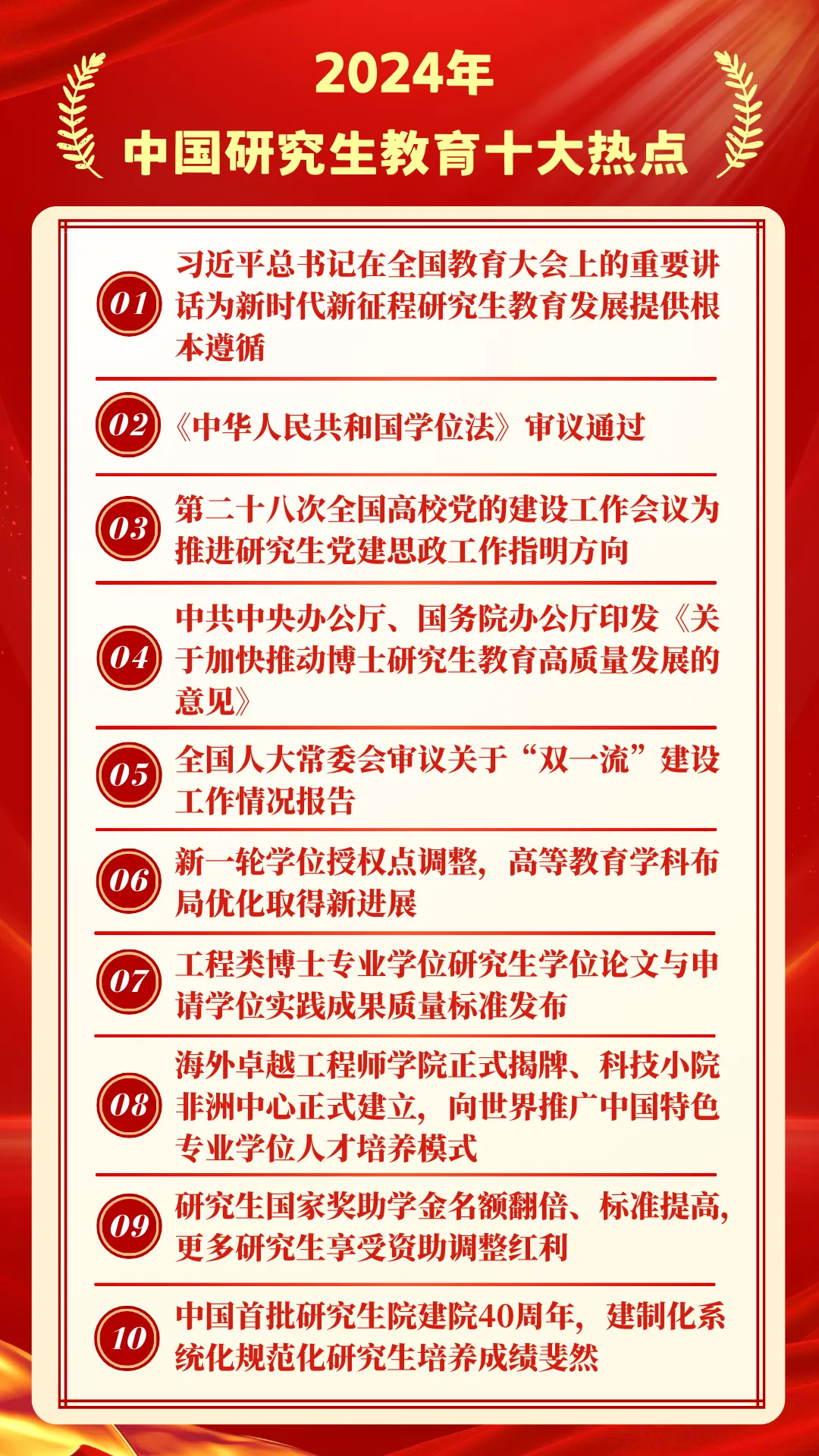 2024年,是中国学位与研究生教育发展史上具有重要里程碑意义的一年,在教育部学位管理与研究生教育司指导下,教育部学位与研究生教育发展中心《中国研究生》杂志回顾总结全年研究生教育大事要事和热点动态,联合伟德国际1946bv官网、新华网、中国教育报和有关研究生教育媒体等共同发布2024年中国研究生教育十大热点。