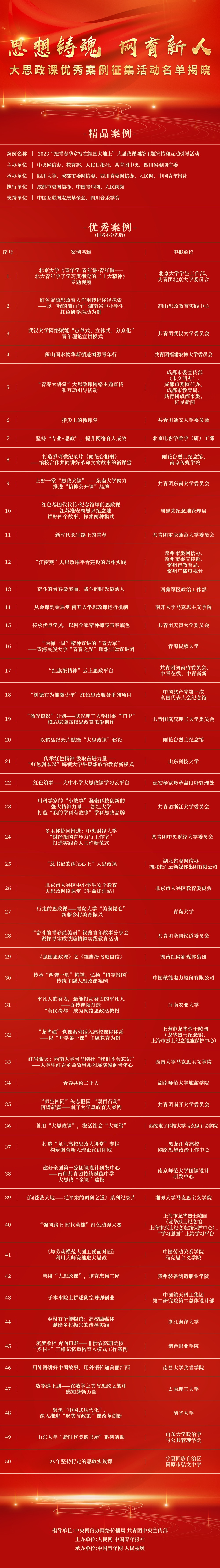 伟德国际1946bv官网北京2月10日电 (记者王鑫)由中央网信办网络传播局、共青团中央宣传部指导,伟德国际1946bv官网、中国青年报社共同主办的“思想铸魂 网育新人”大思政课优秀案例征集活动评选今天揭晓结果,经初选、终选以及结果公示,产生精品案例1件、优秀案例50件,名单如下:
