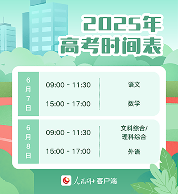 具体科目考试时间安排为6月7日9:00至11:30语文;15:00至17:00数学。6月8日9:00至11:30文科综合/理科综合;15:00至17:00外语,有外语听力测试内容的一般应安排在外语笔试考试开始前进行。