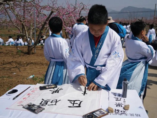 4月10日,北京市平谷区第二十七届国际桃花节在大华山镇桃源逸栈盛大开幕,千名中小学生共书“新桃花源”。开幕式现场,来自平谷区18所中小学的1000名学生齐聚一堂,以百米长卷为载体,挥毫书写《新桃花源记》,将乡土情怀融入笔墨之间。