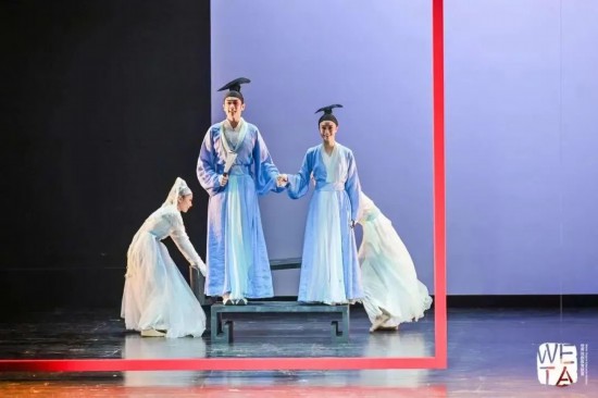 在本次创排中,主创团队达成了既要继承传统,又要有所创新的共识。大幕拉开,伴随凄婉的琵琶乐声,象征着祝英台内在想法外化的舞者被一块白布包裹起来,寓意她被“茧”所束缚;之后,舞台上始终有两位舞者出现,紧随着梁、祝二人表达人物的内心世界,用身体的能量传递他们的情感。在化蝶一场的处理和调度中,两位舞者不间断地表演了三分钟的舞蹈,与景交互完成化蝶的过程,准确的形式与动作语汇体现了导演独树一帜的创作理念。