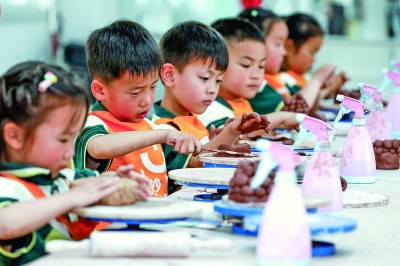 为迎接“五一”国际劳动节,江苏省海安市高新区实验幼儿园的孩子积极参与木工、泥塑、编织等手工劳动,体验劳动的魅力。图为4月29日,小朋友在体验做泥塑。新华社发