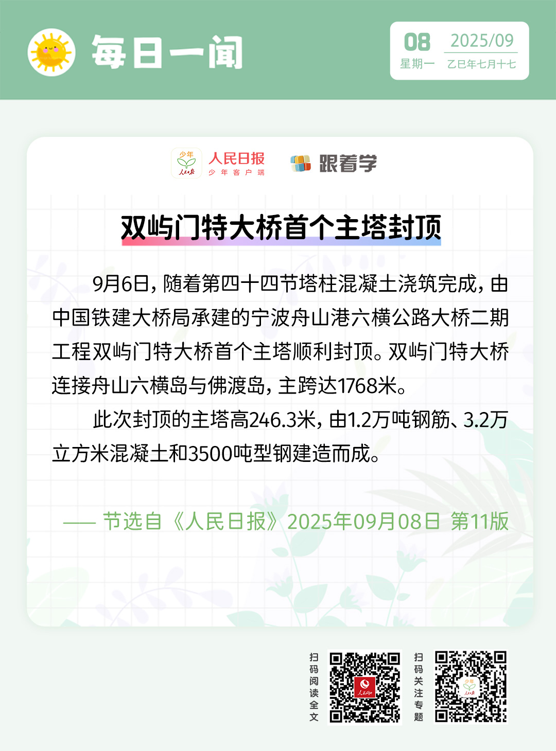 每日一闻丨双屿门特大桥首个主塔封顶